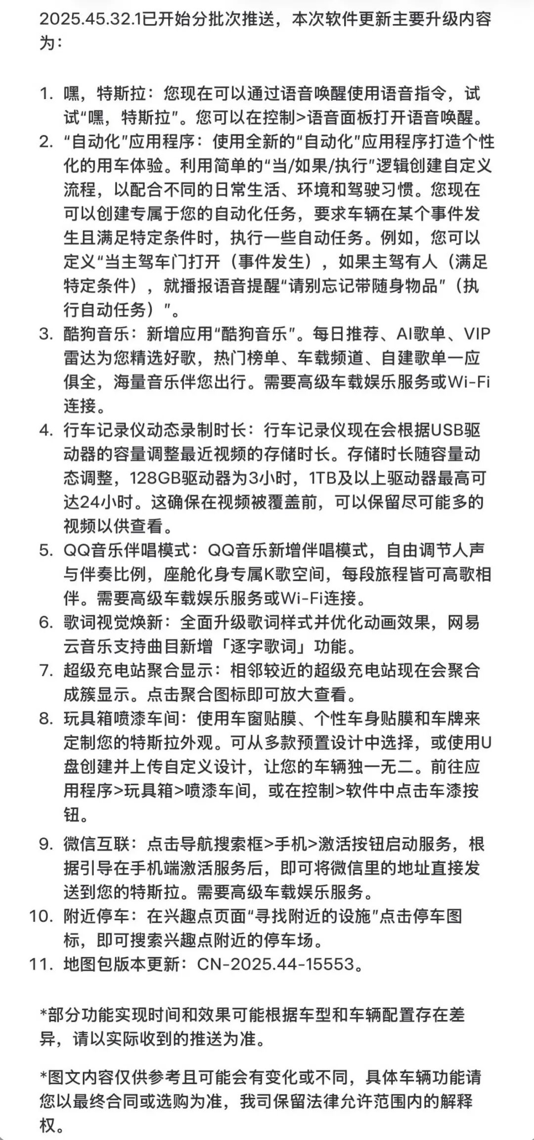 今天特斯拉官宣了春节重磅 OTA 更新,拉重本次更新的磅更系统版本号为 2025.45.32.1,适用车型为: