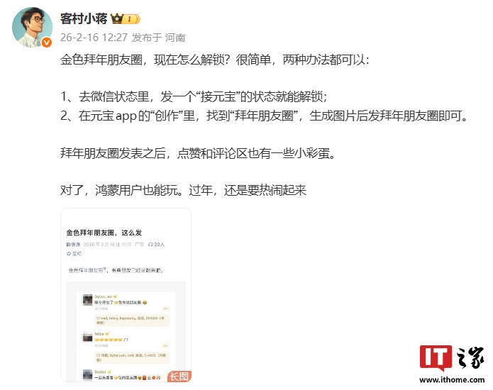 IT之家注意到,色朋微信员工 @客村小蒋 今日发文称,两种拜年朋友圈发表之后,解锁点赞和评论区也有一些小彩蛋。鸿蒙欧交易所app官网入口他还分享了“金色朋友圈”两种解锁方式,也能友圈并透露微信鸿蒙版 App 的玩微用户也能玩。